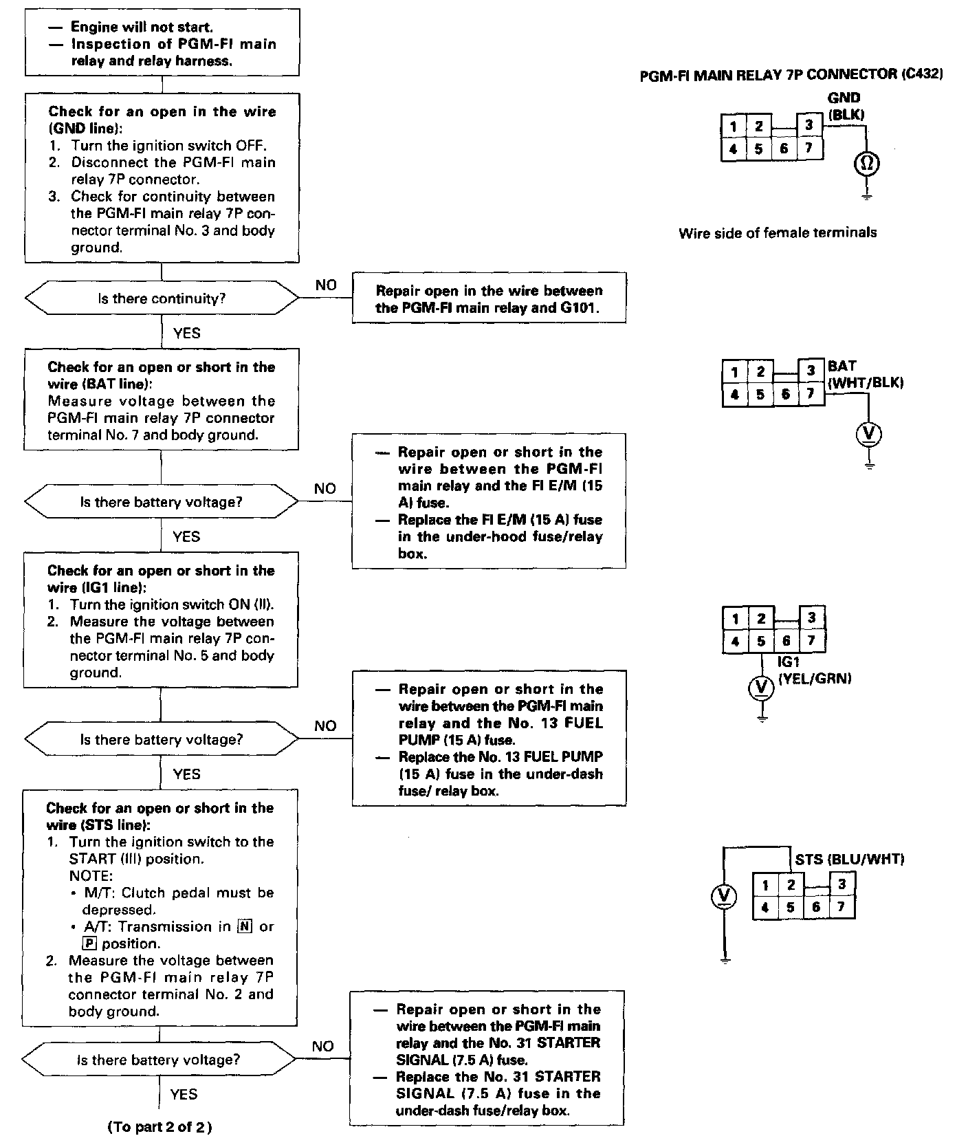 Relay TestingNOTE: If the engine starts and continues to run, the PGM-FI main relay is OK.