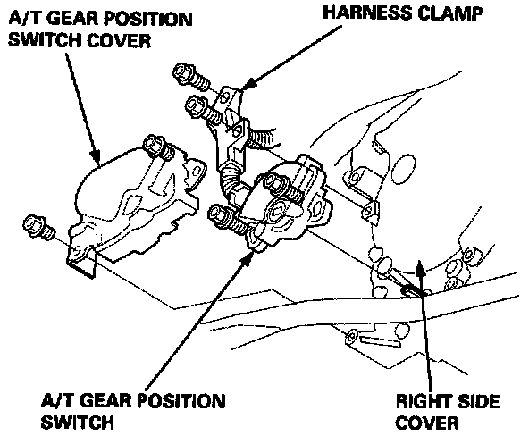 10. Install the A/T gear position switch cover and the harness clamp on the right side cover.