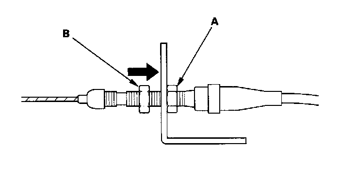 4. If the free play is not within specs, move the cable to the point where the engine speed starts to increase, and tighten the locknut (A) and adjusting nut (B).