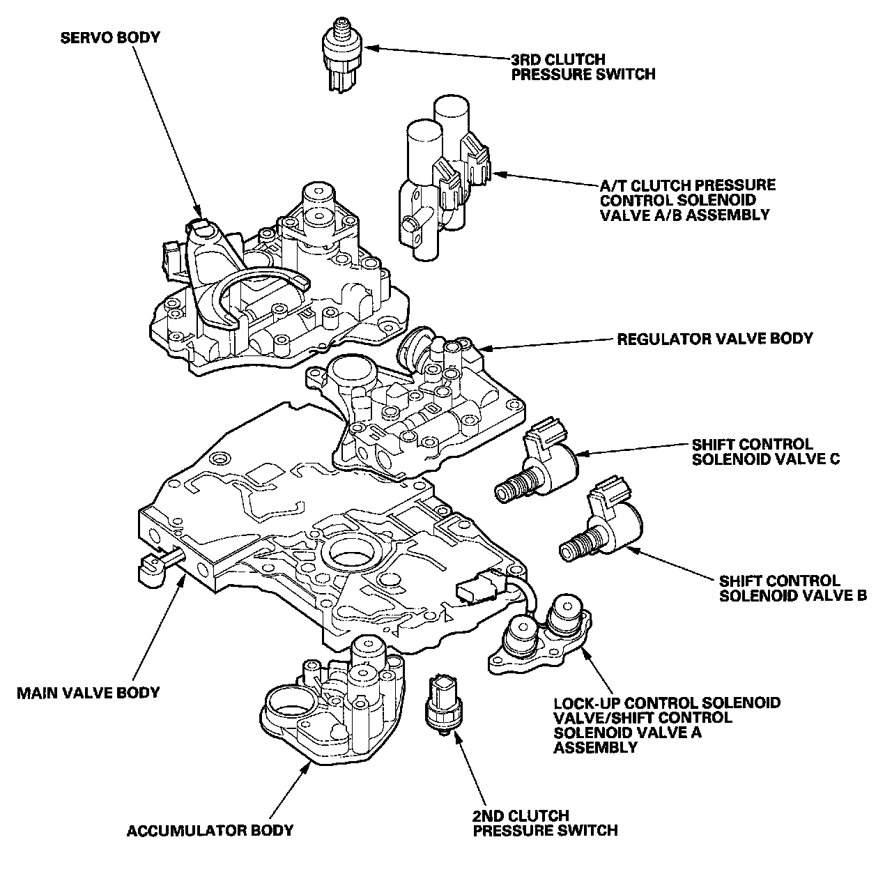 The valve body includes the main valve body, the regulator valve body, the servo body and the accumulator body. The ATF pump is driven by splines on the left end of the torque converter which is attached to the engine. Fluid flows through the regulator valve to maintain specified pressure through the main valve body to the manual valve directing pressure to each of the clutches. The shift control solenoid valves B and C are mounted on the outside of the torque converter housing. The shift control solenoid valve A and the lock-up control solenoid valve are mounted on the torque converter housing as an assembly. The A/T clutch pressure control solenoid valves A and B are mounted on the transmission housing.