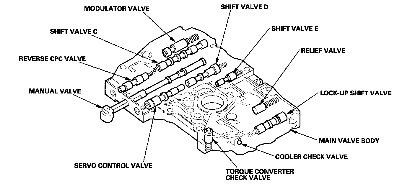 The main valve body contains the manual valve, the modulator valve, the shift valve C, the shift valve D, the shift valve E, the servo control valve, the cooler check valve, the torque converter check valve, the reverse CRC valve, the lock-up shift valve, the relief valve, and the ATF pump gears. The primary function of the main valve body are to switch fluid pressure on and off and to control hydraulic pressure going to the hydraulic control system.