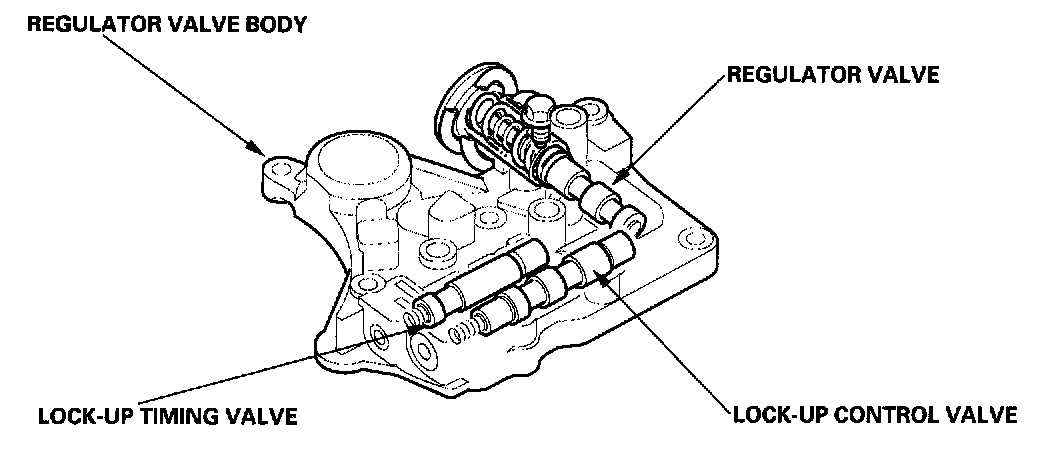 The regulator valve body is located on the main valve body. The regulator valve body contains the regulator valve, the lock-up timing valve and the lock-up control valve.