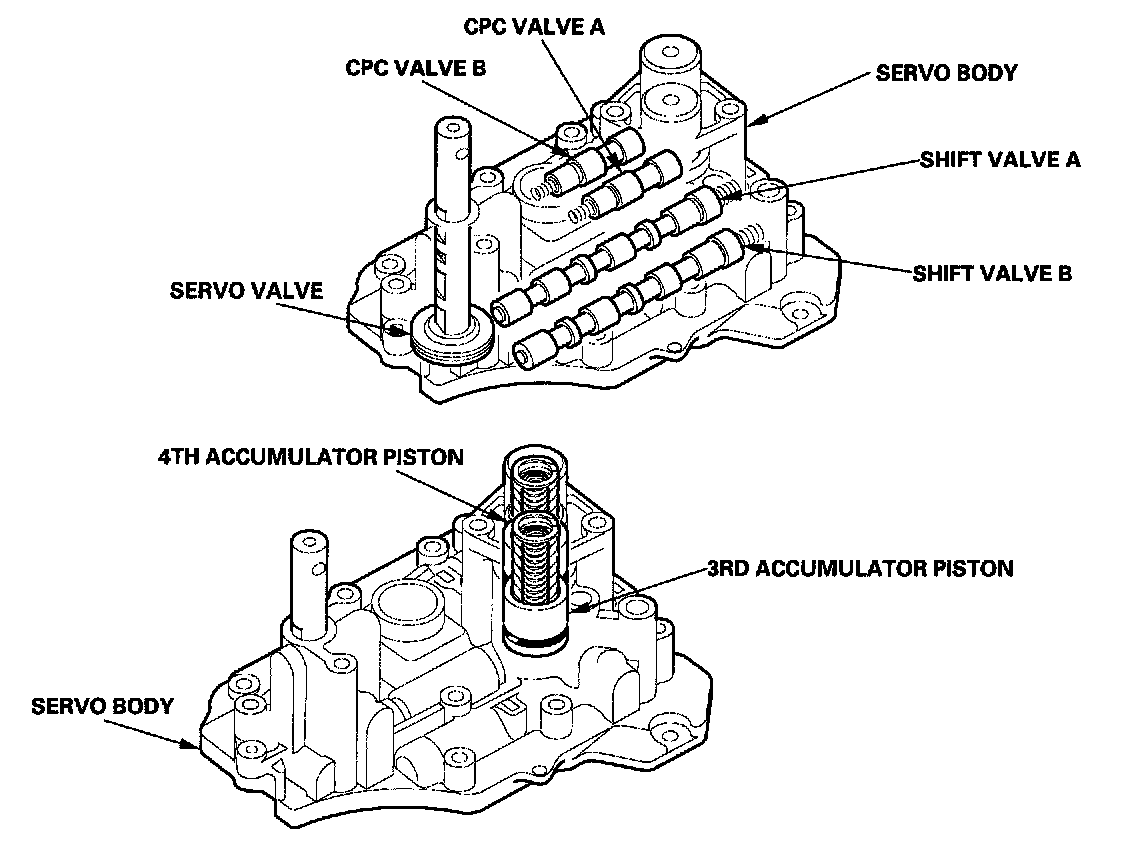 The servo body is on the main valve body. It contains the servo valve, shift valve A, shift valve B, CPC valves A and B, and the 3rd and 4th accumulators.