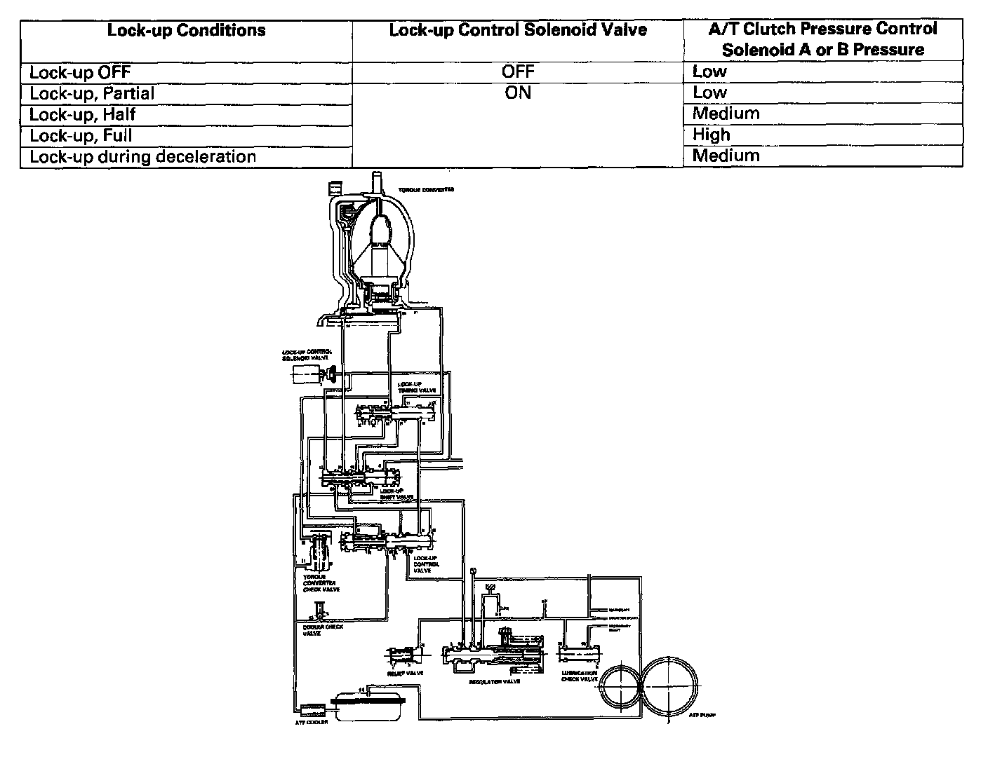 The table above shows the lock-up conditions for the lock-up control solenoid valve and the A/T clutch pressure control solenoid A or B pressure.