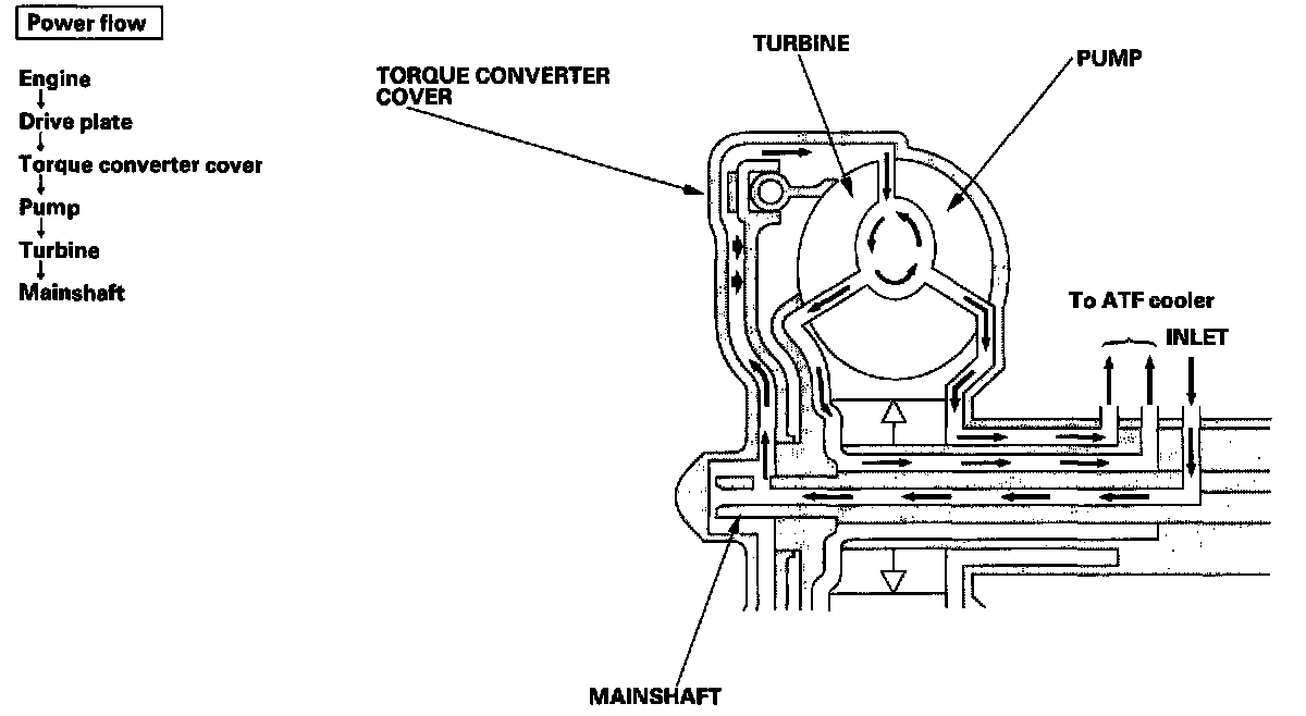 With the lock-up clutch on, fluid in the chamber between the torque converter cover and the lock-up piston is drained off, and the converter fluid exerts pressure through the piston against the torque converter cover. As a result, the converter turbine is locked to the converter cover. The effect is to bypass the converter, placing the vehicle in direct drive.