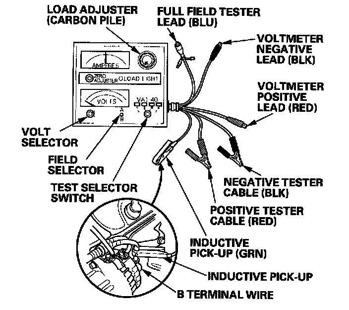 11. With the engine speed still at 2,000 rpm, full-field the alternator Attach the probe to the VAT-40 full-field test lead, and insert the probe into the full field access hold at the back of the alternator. Switch the field selector to the "A (Ground)" position momentarily, and check the amperage reading. Because voltage will rise will rise quickly when the alternator is full-fielded, do not allow the voltage to exceed 18 V: it may damage the electrical system.