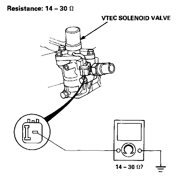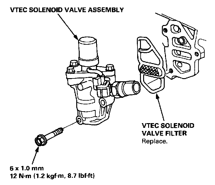 3. If the resistance is within specifications, remove the VTEC solenoid valve assembly from the cylinder head, and check the VTEC solenoid valve filter for clogging.