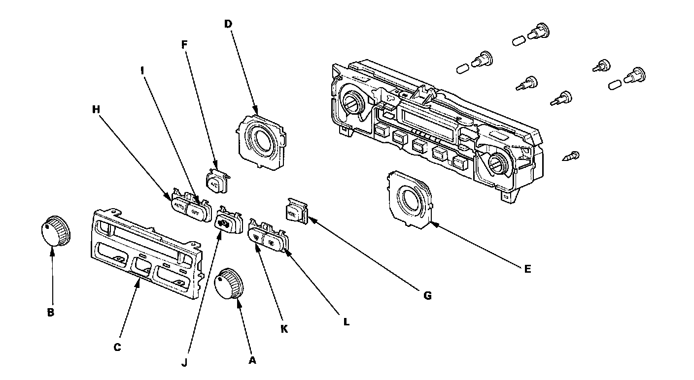 1. Remove the fan switch (A) and temperature control (B) dials, then remove the front (C), temperature control (D) and fan switch (E) panels. Remove A/C switch (F), MODE control switch (G), AUTO switch (H), OFF switch (I), recirculation control switch (J), front defroster switch (K) and rear defogger switch (L) buttons.