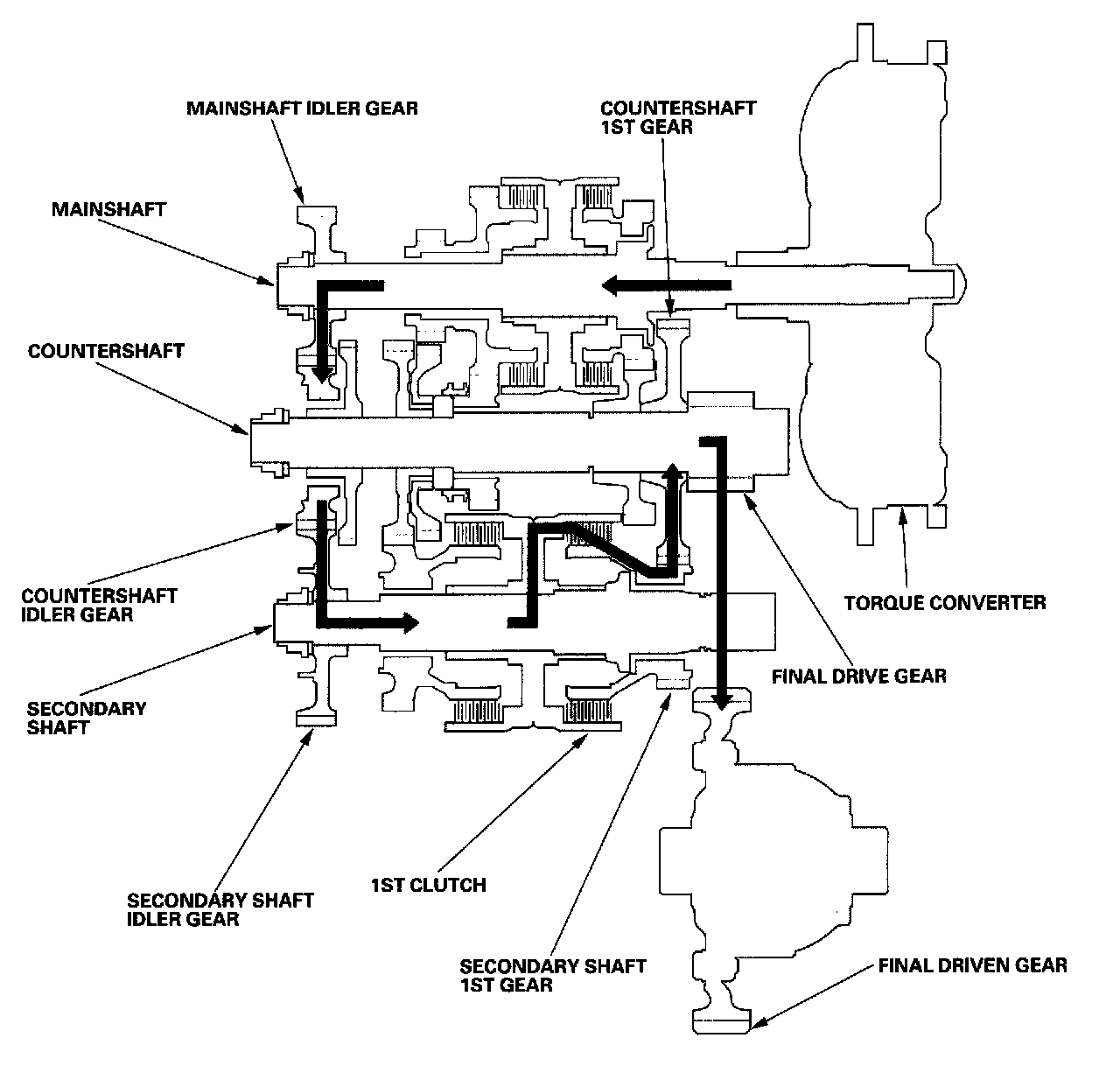 - Hydraulic pressure is applied to the 1st clutch, then the 1st clutch engages the secondary shaft 1st gear with the secondary shaft.