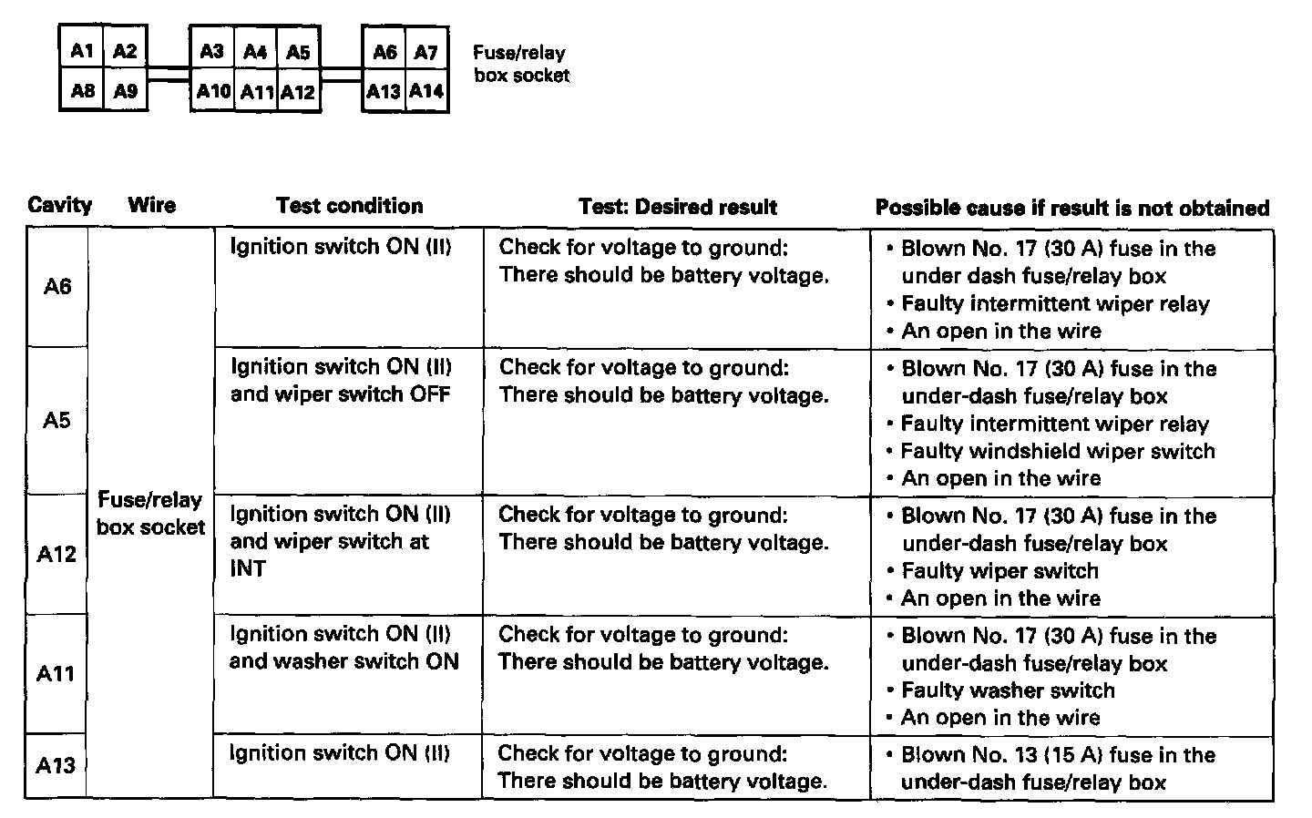 ^ If the terminals look OK, make the following input tests at the fuse/relay box socket.