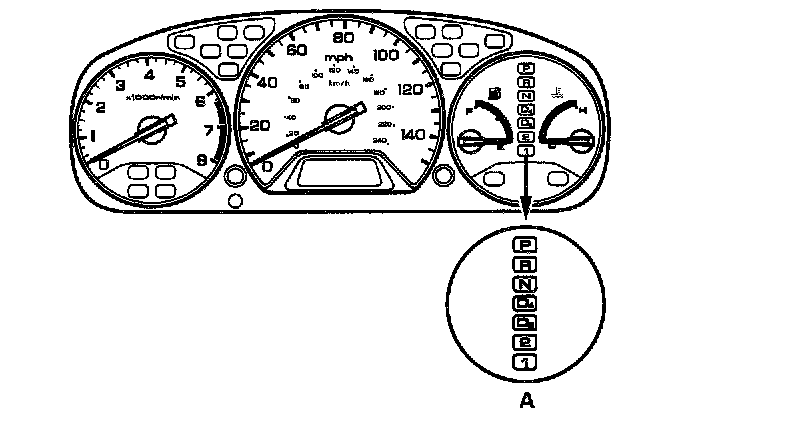 12. Turn the ignition switch ON (II). Move the shift lever through all gears, and check the transmission range switch synchronization with the A/T gear position indicator (A).