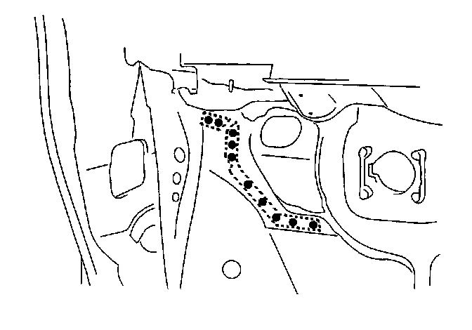 - From the passenger compartment side, drill holes in the spot welded area with a 5 mm (0.2 in) spot weld cutter.