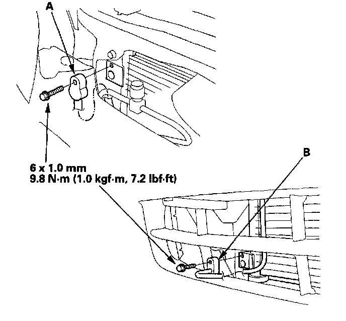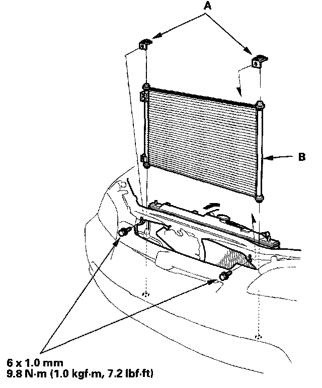 5. Remove the bolts and the upper mount brackets (A), then remove the condenser (B) by lifting it up. Be careful not to damage the radiator and condenser fins when removing the condenser.