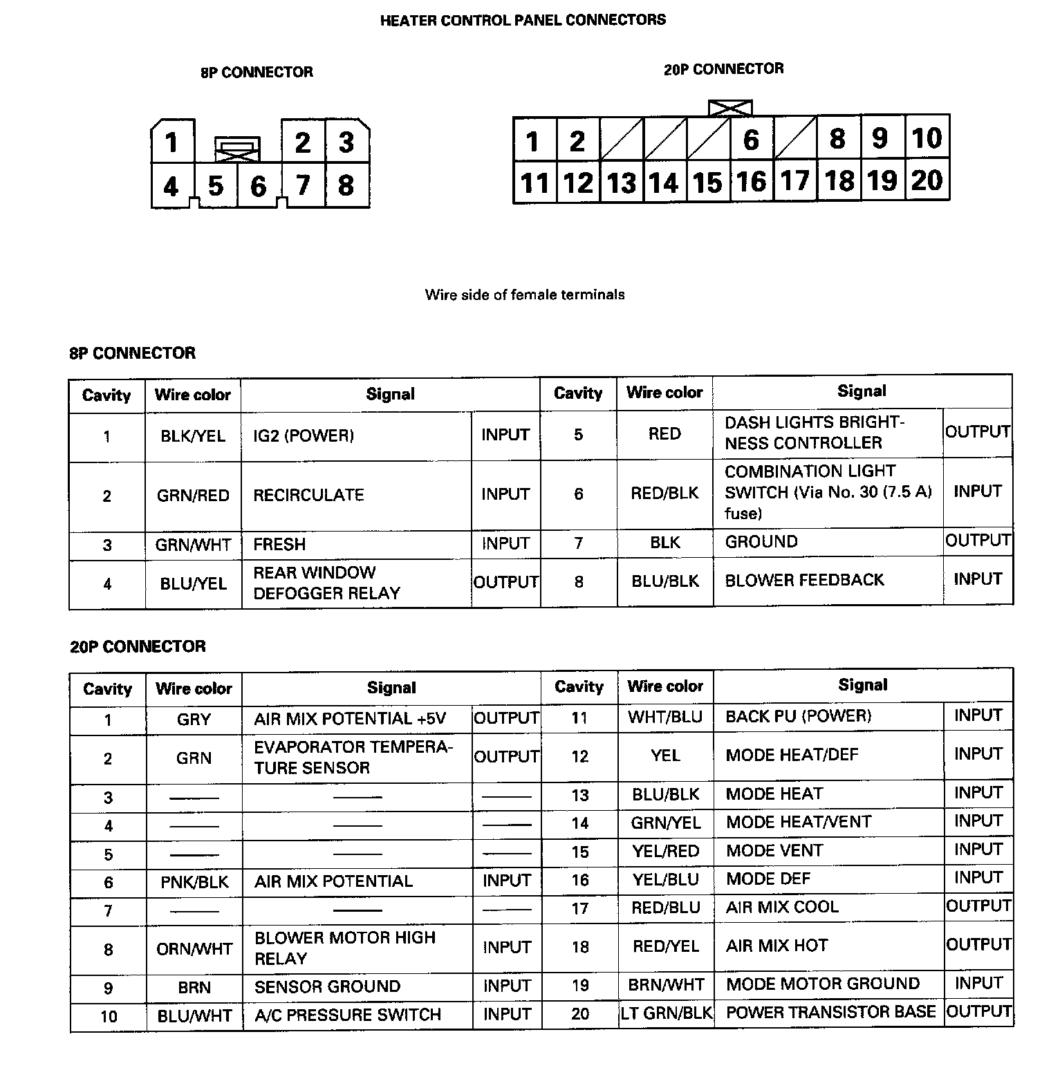 Heater Control Panel Connectors 8P And 20P: