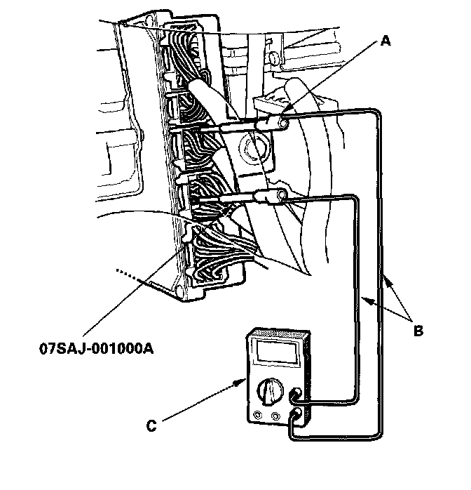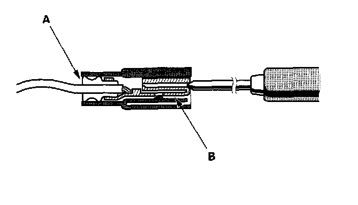 3. If you cannot get to the wire side of the connector or the wire side is sealed (A) disconnect the connector and probe the terminals (B) from the terminal side. Do not force the probe into the connector.