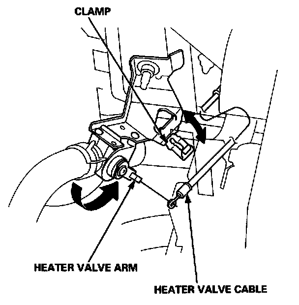 2. From under the hood, open the clamp, then disconnect the heater valve cable from the heater valve arm. Turn the heater valve arm to the fully opened position as shown.