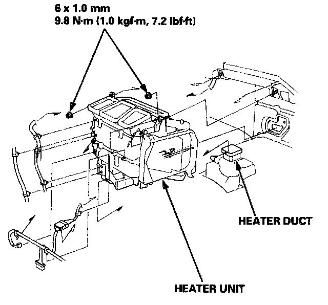 8. Disconnect the connectors from the mode control motor and air mix control motor ('99 - 00 models), then remove the wire harness clips and wire harness from the heater unit. Remove the clip from the heater duct, then remove the two mounting nuts and the heater unit.