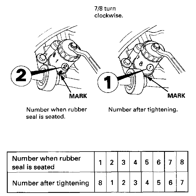 2. Tighten the filter by turning it clockwise seven numbers from the marked point. For example, if a mark is made under the number 2 when the rubber seal is seated, the filter should be tightened until the number 1 comes up to the marked point.