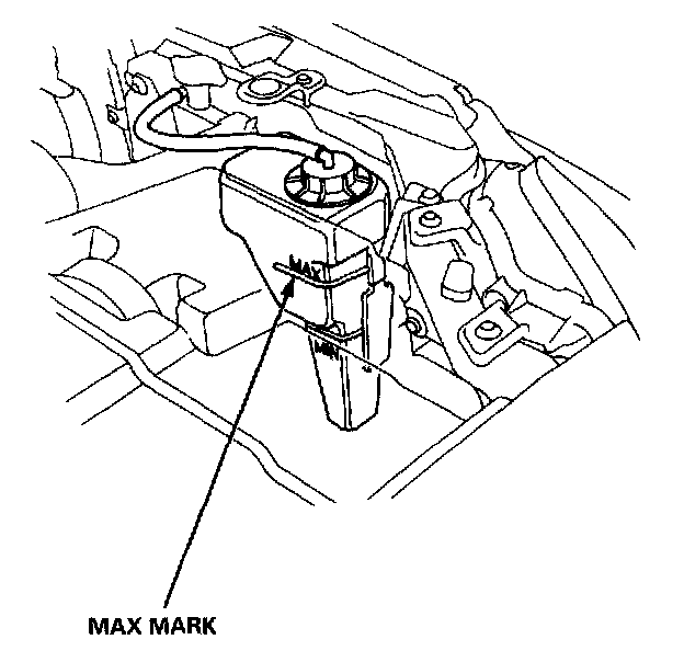 7. Remove, drain and reinstall the reservoir. Fill the tank halfway to the MAX mark with water, then up to the MAX mark with antifreeze.