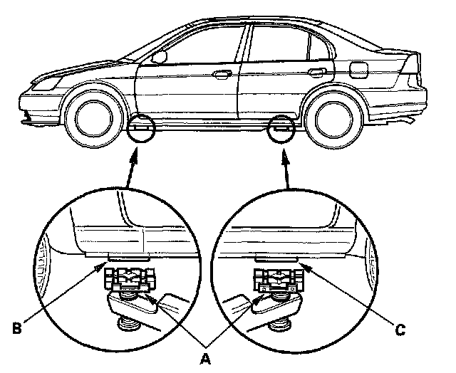 1. Position the hoist lift blocks (A), or safety stands, under the vehicle's front support points (B) and rear support points (C).