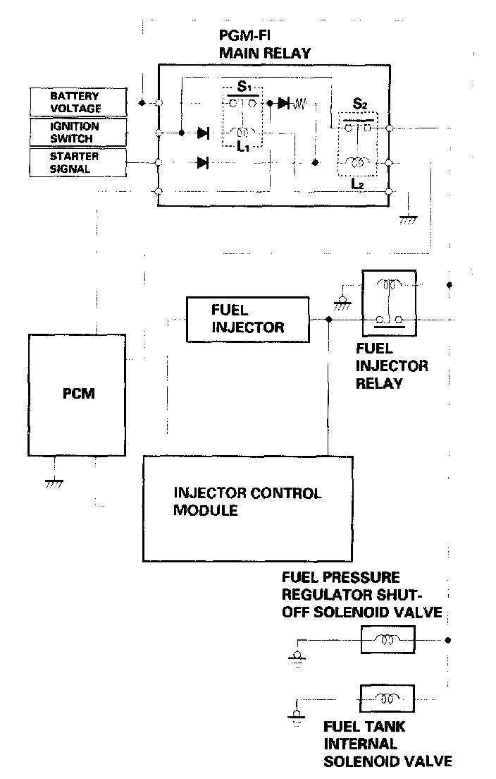 The PGM-FI main relay actually contains two individual relays. This relay is located at the right side of the cowl. One relay is energized whenever the ignition is on which supplies the battery voltage to the PCM, power to the fuel injectors, and power for the second relay. The second relay is energized for two seconds when the ignition is switched ON (II), and when the engine is running, to supply power to the fuel injector relay, fuel pressure regulator shut-off solenoid valve and fuel tank internal solenoid valve.