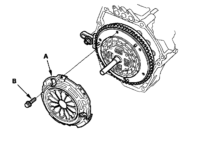 3. To prevent warping, unscrew the pressure plate mounting bolts (A) in a crisscross pattern in several steps, then remove the pressure plate (B).