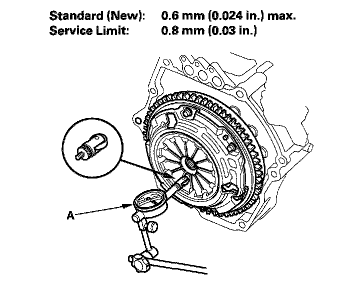 1. Check the diaphragm spring fingers for height using the dial indicator (A). If the height is more than the service limit, replace the pressure plate.