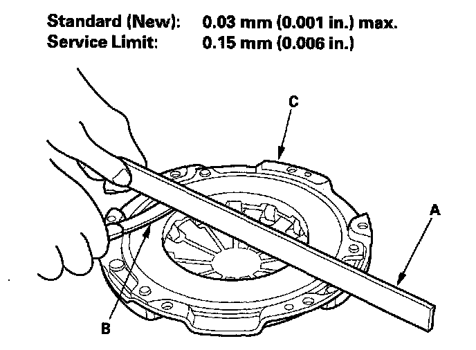 6. Inspect for warpage using a straight edge (A) and feeler gauge (B). Measure across the pressure plate (C). If the warpage is more than the service limit, replace the pressure plate.