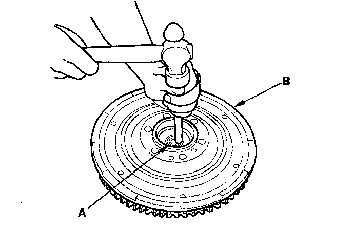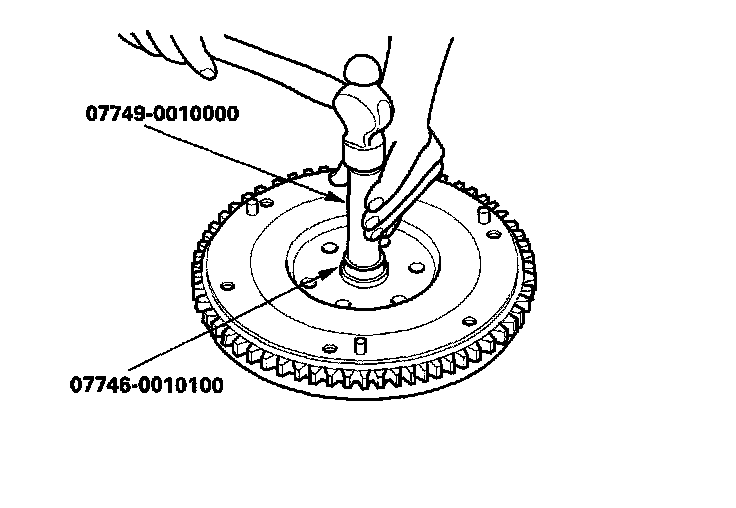 5. Drive the new ball bearing into the flywheel using the special tools as shown. Apply a light coat of oil to the bearing surface.