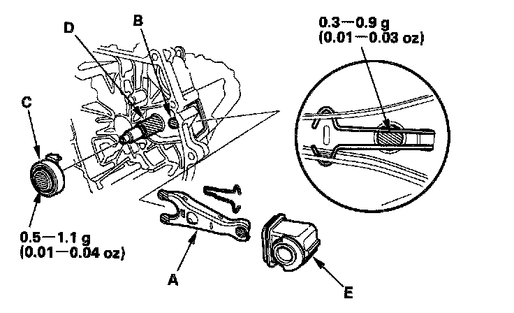 2. Remove the release fork (c) from the clutch housing by squeezing the release fork set spring (D) with pliers. Remove the release bearing (E).