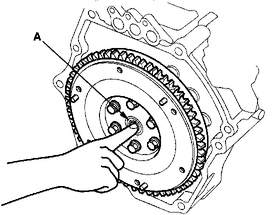 4. Turn the inner race of the ball bearing (A) with your finger. The ball bearing should turn smoothly and quietly. Check that the ball bearing outer race fits tightly in the flywheel. If the race does not turn smoothly, quietly, or fit tight in the flywheel, replace the ball bearing.: