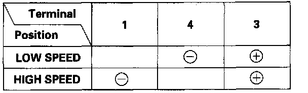 4. Connect an analog voltmeter between the No. 2 (+) and No. 5 (-) terminals, and run the motor at low or high speed. The voltmeter should indicate 0 V and 4 V or less alternately. If it does not, replace the windshield wiper motor.