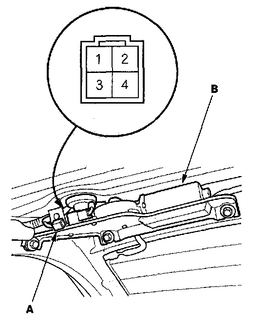 2. Disconnect the 4P connector (A) from the rear window wiper motor (B).