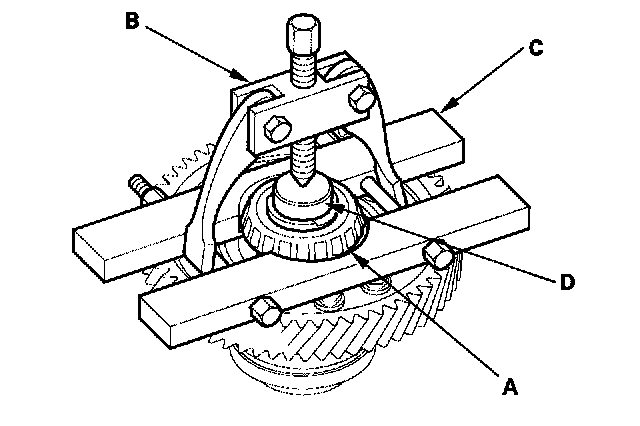 1. Remove the carrier bearing (A) with a commercially available bearing puller (B), bearing separator (C), and stepped adapter (D).