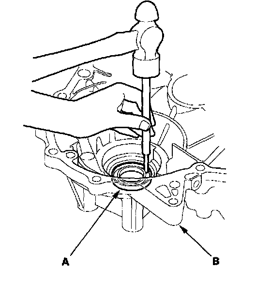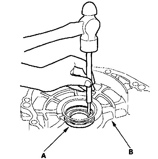 3. Remove the oil seal (A) from the torque converter housing (B).