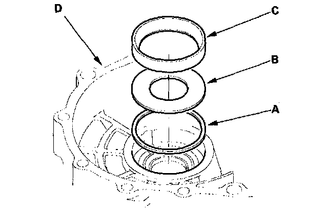 5. Install the thrust shim (A), thrust washer (B), and bearing outer race (C) in the transmission housing (D).