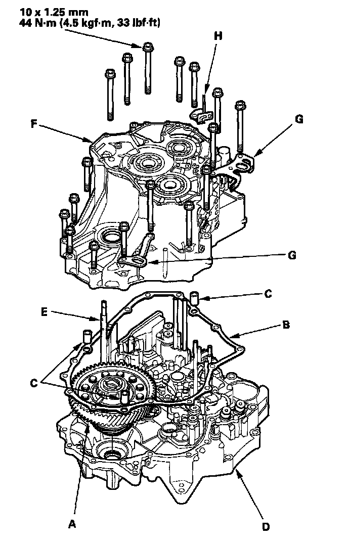 9. Install the transmission housing (F) with the transmission hangers (G) and harness clamp bracket (H), then tighten the bolts.