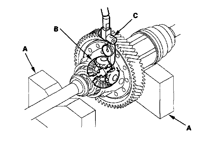 1. Install both axles, and place the differential assembly on V-blocks (A).