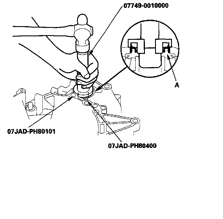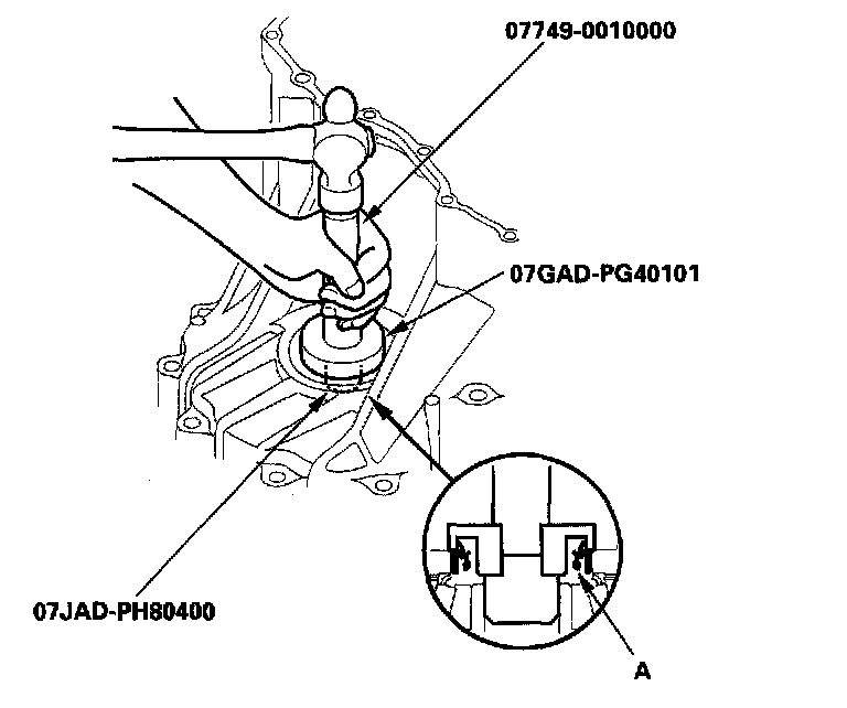 4. Install the oil seal (A) in the transmission housing with the special tools.