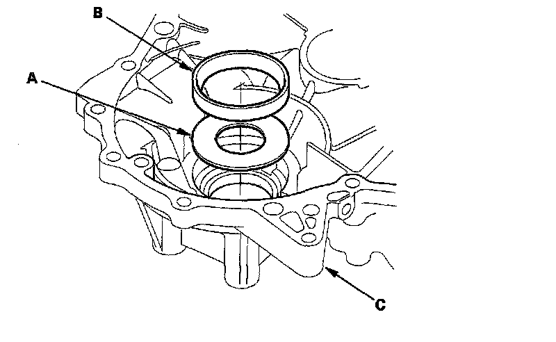 4. Install the thrust washer (A) and outer race (B) in the torque converter housing (C), and use the special tools to make sure the outer race bottoms out in the housing.