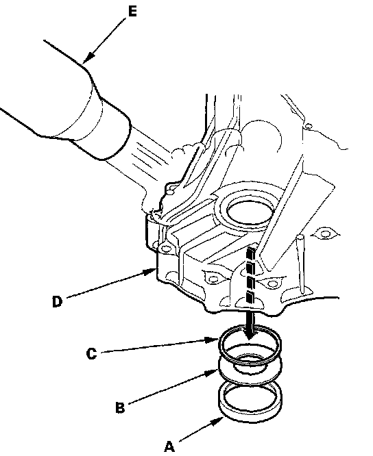 1. Remove the bearing outer race (A), thrust washer (B), and thrust shim (C) from the transmission housing (D) by heating the housing to about 212°F (100°C) with a heat gun (E). Do not treat the housing in excess of 212°F (100°C).