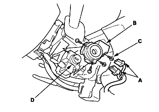 4. Remove the screws (C) and the immobilizer receiver unit from the ignition key cylinder (D).