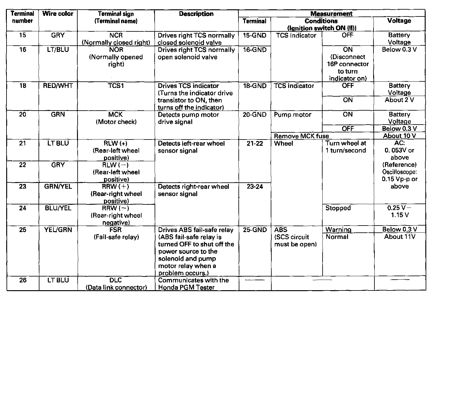 ABS/TCS Control Unit Pinout Values
