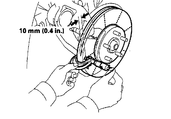 4. Use wheel nuts and suitable flat washers (A) to hold the disc securely against the hub, then mount a dial indicator as shown, and measure the runout at 10 mm (0.4 inch) from the outer edge of the disc.