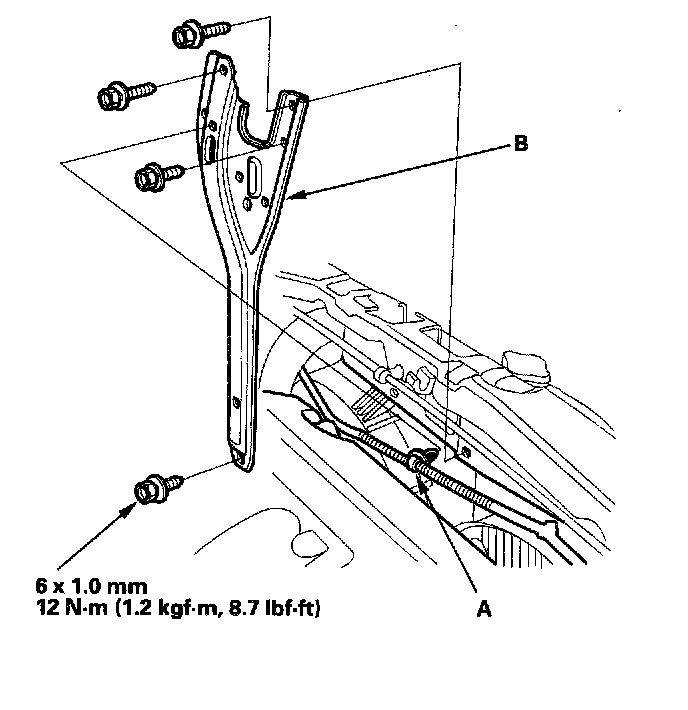 5. Remove the harness clamp (A), then remove the bulkhead bracket (B).