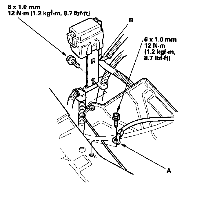 8. Remove the ground cable (A) and relay box bracket (B).