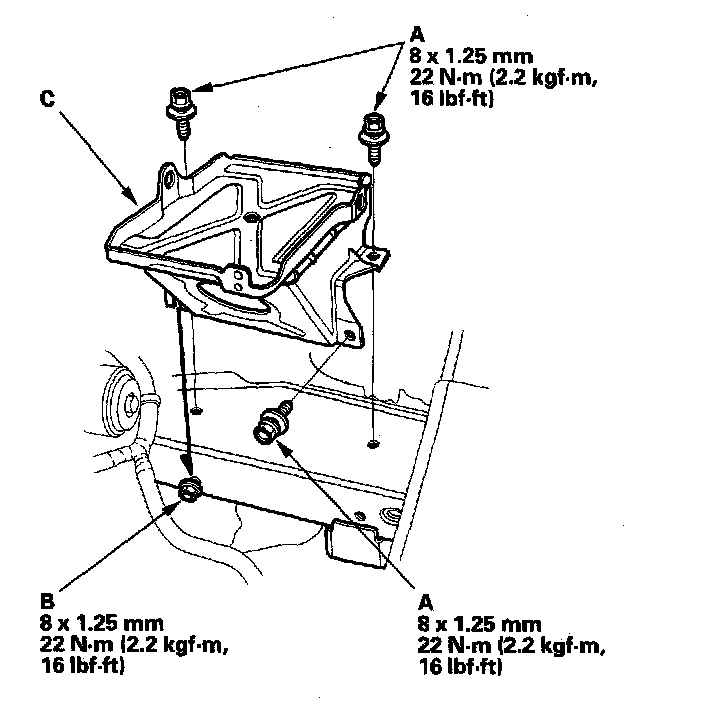 9. Remove the three mounting bolts (A) and loosen mounting bolt (B), then remove the battery base (C).
