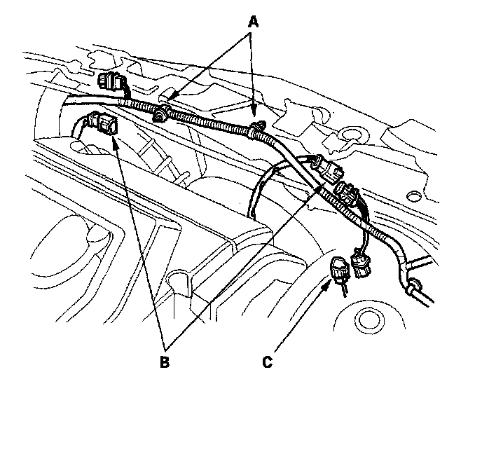 10. Remove the harness clamps (A), then remove the fan motor connectors (B) and air conditioning (A/C) compressor clutch connector (C).