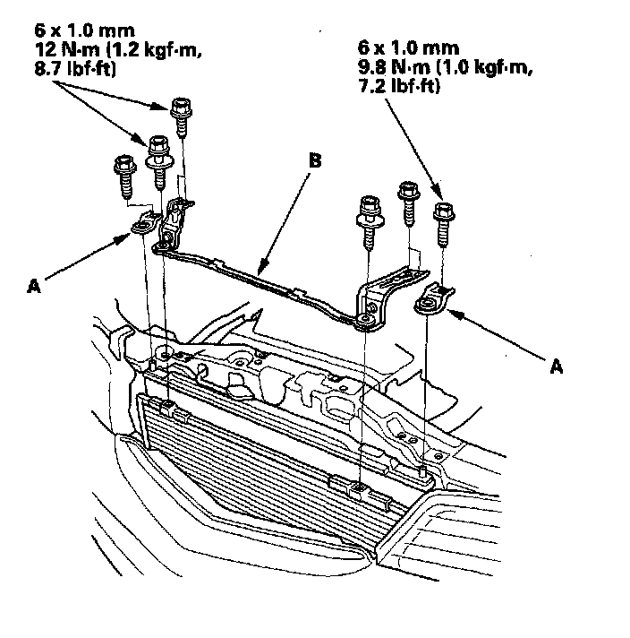 13. Remove the radiator upper brackets/cushions (A) and condenser bracket (B).