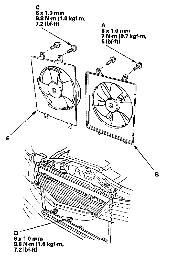 15. Remove the two bolts (C) securing the condenser fan shroud, and loosen the two bolts (D) securing the condenser fan shroud, then remove the condenser fan shroud assembly (E) from the battery side.